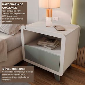 O Conjunto 2 Mesas de Cabeceira Mabel une design moderno, praticidade e acabamento de alto padrão, trazendo para o quarto o mesmo padrão de qualidade dos móveis planejados. Produzidas em 100% MDF com revestimento BP e fita de borda PVC 0,045cm, oferecem durabilidade, resistência e sofisticação. Cada mesa possui 1 gaveta ampla e 1 nicho aberto, perfeitos para organizar livros, objetos pessoais ou apoiar luminárias e itens decorativos. Com pés robustos e acabamento refinado, são peças versáteis que combinam facilmente com cabeceiras, camas e guarda-roupas em tons amadeirados, brancos ou cinza. Com 55 cm de altura, são ideais para garantir funcionalidade e elegância ao lado da cama. Acabamento da Gaveta: Melamínico Acabamento dos Pés: Melamínico Altura dos Pés: 11,5 cm Ambiente Principal: Quarto Complexidade da Montagem: Média: pode ser montado por mais de uma pessoa e/ou necessite de maior conhecimento para montagem Cor: Branco/ Verti Cor do Produto: Branco/ Verti Cor Flex: Não Cor Interna: Branco Escala de Brilho: Fosco Escala de Brilho da Gaveta: Fosco Gaveta com Chave: Não Informações Complementares: Limpar somente com um pano levemente umedecido. Indicado para ambientes internos. Itens Inclusos: 2 Mesas de Cabeceira, Kits Ferragens e Manual de Montagem Linha ou Coleção: Mabel Manual de Montagem e Instalação: https://product-hub-prd.madeiramadeira.com.br/857181094/documents/9f6ad25a-009e-428a-8d13-c70b801562e93106044657817538823513136.pdf Marca: FD Material da Gaveta: MDF Material dos Pés: MDF Material Principal: MDF Montagem Flex: Não Necessita Montagem: Sim Origem do Produto: Nacional Pés Reguláveis: Não Peso: 15 kg Peso Máximo por Gaveta: 5 kg Pet Friendly: Não Possui Espelho: Não Possui Possui Nichos: 02 Possui Pés: 08 Possui Portas: Não Possui Prateleiras: Não Possui Vidro: Não Quantidade de Nichos: 02 Recomendações de Uso, Manutenção e Limpeza: Limpar somente com um pano levemente umedecido. Indicado para ambientes internos Sapatas Niveladoras: Não Sistema de Montagem: Parafusos, cavilhas e minifix Suporta Até (kg): 5 kg Tipo de Corrediça da Gaveta: Metálica Telescópica Tipo de Puxador da Gaveta: Embutido