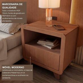 O Conjunto 2 Mesas de Cabeceira Mabel une design moderno, praticidade e acabamento de alto padrão, trazendo para o quarto o mesmo padrão de qualidade dos móveis planejados. Produzidas em 100% MDF com revestimento BP e fita de borda PVC 0,045cm, oferecem durabilidade, resistência e sofisticação. Cada mesa possui 1 gaveta ampla e 1 nicho aberto, perfeitos para organizar livros, objetos pessoais ou apoiar luminárias e itens decorativos. Com pés robustos e acabamento refinado, são peças versáteis que combinam facilmente com cabeceiras, camas e guarda-roupas em tons amadeirados, brancos ou cinza. Com 55 cm de altura, são ideais para garantir funcionalidade e elegância ao lado da cama. Acabamento da Gaveta: Melamínico Acabamento dos Pés: Melamínico Altura dos Pés: 11,5 cm Ambiente Principal: Quarto Complexidade da Montagem: Média: pode ser montado por mais de uma pessoa e/ou necessite de maior conhecimento para montagem Cor: Castanho Cor do Produto: Castanho Cor Flex: Não Cor Interna: Branco Escala de Brilho: Fosco Escala de Brilho da Gaveta: Fosco Gaveta com Chave: Não Informações Complementares: Limpar somente com um pano levemente umedecido. Indicado para ambientes internos. Itens Inclusos: 2 Mesas de Cabeceira, Kits Ferragens e Manual de Montagem Linha ou Coleção: Mabel Manual de Montagem e Instalação: https://product-hub-prd.madeiramadeira.com.br/929141797/documents/fdadd23c-a34b-4377-a4e7-d511c99ee1c23106044657817538823513136.pdf Marca: FD Material da Gaveta: MDF Material dos Pés: MDF Material Principal: MDF Montagem Flex: Não Necessita Montagem: Sim Origem do Produto: Nacional Pés Reguláveis: Não Peso: 15 kg Peso Máximo por Gaveta: 5 kg Pet Friendly: Não Possui Espelho: Não Possui Possui Nichos: 02 Possui Pés: 08 Possui Portas: Não Possui Prateleiras: Não Possui Vidro: Não Quantidade de Nichos: 02 Recomendações de Uso, Manutenção e Limpeza: Limpar somente com um pano levemente umedecido. Indicado para ambientes internos Sapatas Niveladoras: Não Sistema de Montagem: Parafusos, cavilhas e minifix Suporta Até (kg): 5 kg Tipo de Corrediça da Gaveta: Metálica Telescópica Tipo de Puxador da Gaveta: Embutido