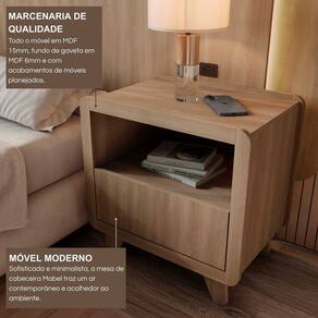 O Conjunto 2 Mesas de Cabeceira Mabel une design moderno, praticidade e acabamento de alto padrão, trazendo para o quarto o mesmo padrão de qualidade dos móveis planejados. Produzidas em 100% MDF com revestimento BP e fita de borda PVC 0,045cm, oferecem durabilidade, resistência e sofisticação. Cada mesa possui 1 gaveta ampla e 1 nicho aberto, perfeitos para organizar livros, objetos pessoais ou apoiar luminárias e itens decorativos. Com pés robustos e acabamento refinado, são peças versáteis que combinam facilmente com cabeceiras, camas e guarda-roupas em tons amadeirados, brancos ou cinza. Com 55 cm de altura, são ideais para garantir funcionalidade e elegância ao lado da cama. Acabamento da Gaveta: Melamínico Acabamento dos Pés: Melamínico Altura dos Pés: 11,5 cm Ambiente Principal: Quarto Complexidade da Montagem: Média: pode ser montado por mais de uma pessoa e/ou necessite de maior conhecimento para montagem Cor: Louro Freijó Grann Cor do Produto: Louro Freijó Grann Cor Flex: Não Cor Interna: Branco Escala de Brilho: Fosco Escala de Brilho da Gaveta: Fosco Gaveta com Chave: Não Informações Complementares: Limpar somente com um pano levemente umedecido. Indicado para ambientes internos. Itens Inclusos: 2 Mesas de Cabeceira, Kits Ferragens e Manual de Montagem Linha ou Coleção: Mabel Manual de Montagem e Instalação: https://product-hub-prd.madeiramadeira.com.br/299472920/documents/75da85e7-38e2-42fb-af0c-65db82e349e33106044657817538823513136.pdf Marca: FD Material da Gaveta: MDF Material dos Pés: MDF Material Principal: MDF Montagem Flex: Não Necessita Montagem: Sim Origem do Produto: Nacional Pés Reguláveis: Não Peso: 15 kg Peso Máximo por Gaveta: 5 kg Pet Friendly: Não Possui Espelho: Não Possui Possui Nichos: 02 Possui Pés: 08 Possui Portas: Não Possui Prateleiras: Não Possui Vidro: Não Quantidade de Nichos: 02 Recomendações de Uso, Manutenção e Limpeza: Limpar somente com um pano levemente umedecido. Indicado para ambientes internos Sapatas Niveladoras: Não Sistema de Montagem: Parafusos, cavilhas e minifix Suporta Até (kg): 5 kg Tipo de Corrediça da Gaveta: Metálica Telescópica Tipo de Puxador da Gaveta: Embutido