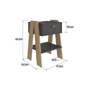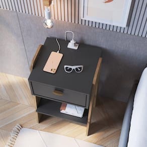 Conjunto 2 Mesas de Cabeceira Terni da Completa Móveis apresenta funcionalidade, praticidade e elegância com design arrojado e atemporal! Possui além da tomada a qual facilitador para carregar seu celular ou tablet, gaveta com corrediça telescópica + prateleira. Ideal para que possa por exemplo colocar um abajur, seu livro de cabeceira, celular, óculos ou outros objetos pessoais. Altura do Conjunto: 66.3 cm Ambiente: null Ambiente Principal: Quarto Cor: Grafite/Aveiro Oak Informação Complementar: 2x Mesa de Cabeceira 1 Gaveta, Prateleira e Tomada Grafite/Aveiro OakLargura: 41,5 cmAltura: 66,3 cmPeso: 11,2 kgProfundidade: 36,5 cmNecessita Montagem: Sim Material Principal: MDP Possui Portas: Não Suporta Até (kg): 16 kg