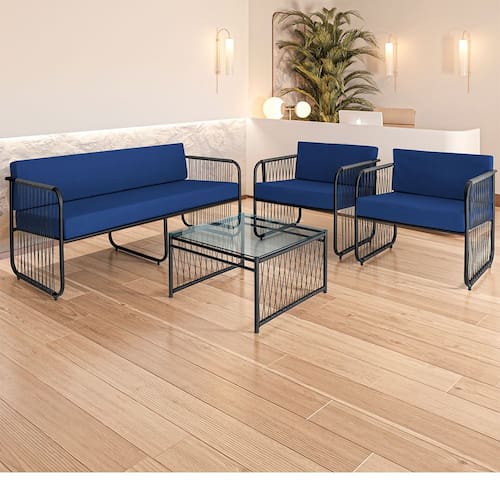 Este elegante conjunto foi desenvolvido para transformar seu ambiente interno com sofistica??o e conforto. Com estrutura em a?o carbono de alta qualidade e acabamento em fibra sint?tica, oferece resist?ncia e durabilidade para suportar as diversas ocasi?es, ideal para ?reas como gourmet, externas, de churrasqueira, recep??o, ed?culas e muito mais.
