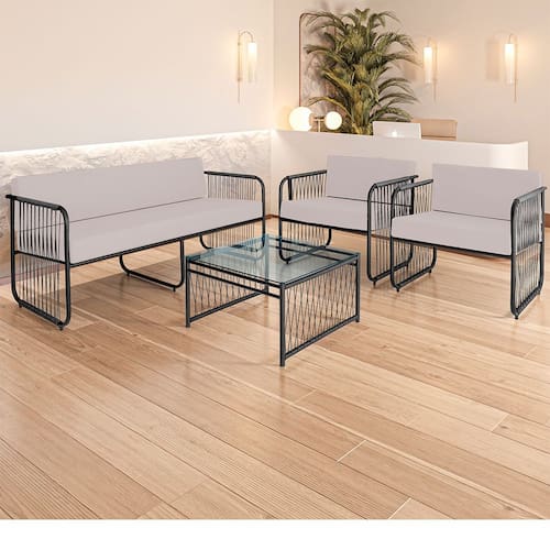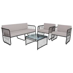 Este elegante conjunto foi desenvolvido para transformar seu ambiente interno com sofistica??o e conforto. Com estrutura em a?o carbono de alta qualidade e acabamento em fibra sint?tica, oferece resist?ncia e durabilidade para suportar as diversas ocasi?es, ideal para ?reas como gourmet, externas, de churrasqueira, recep??o, ed?culas e muito mais.