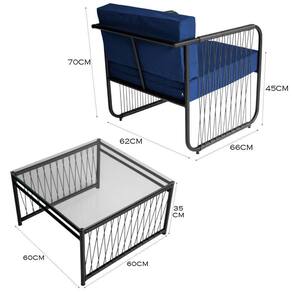 Conjunto 2 Poltronas E Mesa Centro Fibra Sintética Córdova Preto/azul Que tal trazer sofisticacao e conforto para sua area externa com o Conjunto Cordova. Composto por 2 Poltronas e 1 mesa de centro, este conjunto e ideal para areas gourmet, churrasqueira, recepcao, ediculas e outros ambientes internos. Sua estrutura em aco carbono e acabamento em fibra sintetica garantem resistencia e durabilidade, enquanto o design moderno e a producao artesanal conferem um toque exclusivo e unico ao seu espaco. As poltronas possuem encosto e assentos estofados com tecido impermeavel, oferecendo maior conforto e praticidade para longos momentos de relaxamento. Perfeito para quem deseja um ambiente elegante e funcional para receber amigos e familia.