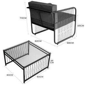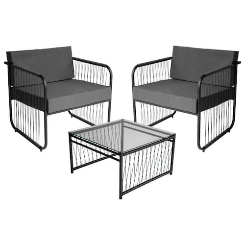 Conjunto 2 Poltronas E Mesa Centro Fibra Sintética Córdova Preto/cinza Que tal trazer sofisticacao e conforto para sua area externa com o Conjunto Cordova. Composto por 2 Poltronas e 1 mesa de centro, este conjunto e ideal para areas gourmet, churrasqueira, recepcao, ediculas e outros ambientes internos. Sua estrutura em aco carbono e acabamento em fibra sintetica garantem resistencia e durabilidade, enquanto o design moderno e a producao artesanal conferem um toque exclusivo e unico ao seu espaco. As poltronas possuem encosto e assentos estofados com tecido impermeavel, oferecendo maior conforto e praticidade para longos momentos de relaxamento. Perfeito para quem deseja um ambiente elegante e funcional para receber amigos e familia.