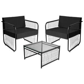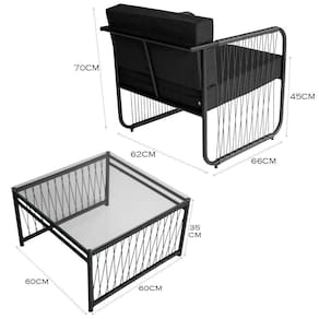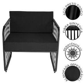 Conjunto 2 Poltronas E Mesa Centro Fibra Sintética Córdova Preto/preto Que tal trazer sofisticacao e conforto para sua area externa com o Conjunto Cordova. Composto por 2 Poltronas e 1 mesa de centro, este conjunto e ideal para areas gourmet, churrasqueira, recepcao, ediculas e outros ambientes internos. Sua estrutura em aco carbono e acabamento em fibra sintetica garantem resistencia e durabilidade, enquanto o design moderno e a producao artesanal conferem um toque exclusivo e unico ao seu espaco. As poltronas possuem encosto e assentos estofados com tecido impermeavel, oferecendo maior conforto e praticidade para longos momentos de relaxamento. Perfeito para quem deseja um ambiente elegante e funcional para receber amigos e familia.