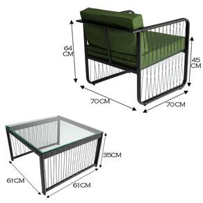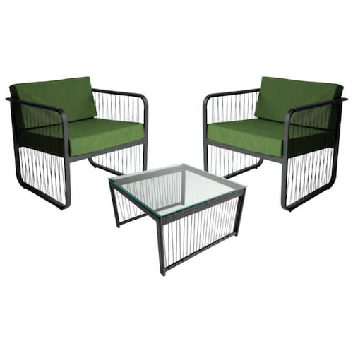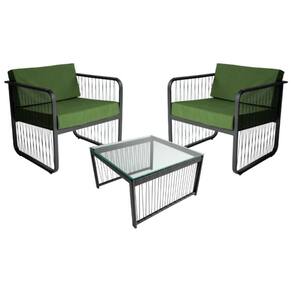 Conjunto 2 Poltronas E Mesa Centro Fibra Sintética Santiago Preto/verde Que tal trazer sofisticacao e conforto para sua area externa com o Conjunto Santiago. Composto por 2 Poltronas e 1 mesa de centro, este conjunto e ideal para areas gourmet, churrasqueiras, ediculas e outros ambientes externos. Sua estrutura em aluminio e acabamento em fibra sintetica garantem resistencia e durabilidade, enquanto o design moderno e a producao artesanal conferem um toque exclusivo e unico ao seu espaco. As poltronas possuem encosto e assentos estofados com tecido impermeavel, oferecendo maior conforto e praticidade para longos momentos de relaxamento. Perfeito para quem deseja um ambiente elegante e funcional para receber amigos e familia.