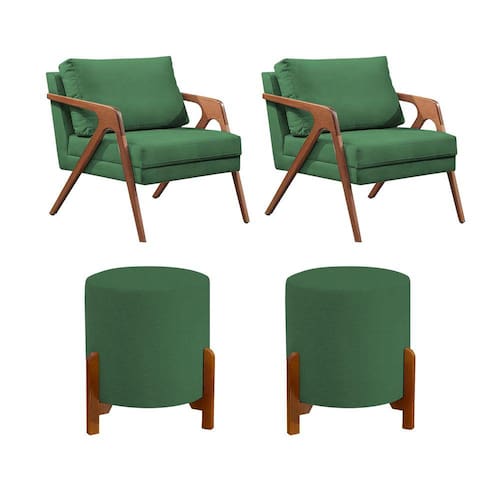 Conjunto 2 Poltronas Mona Decorativa e 2 Puff Thor Estofado Base Madeira Maciça Linho Verde