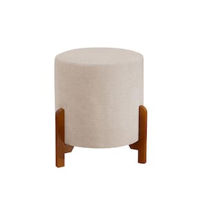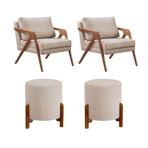 Conjunto 2 Poltronas Mona Decorativa e 2 Puff Thor Estofado Base Madeira Maciça Veludo Bege
