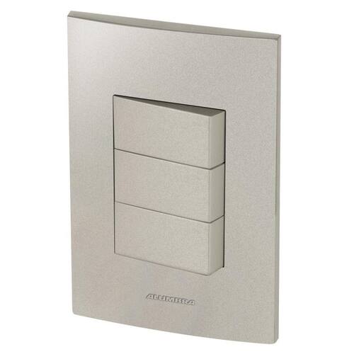 Alumbra inova pro class - placas titanium / módulos titanium linha modular de interruptores e tomadas conjunto completo desmontado: 2 módulos de interruptor simples 1 módulo de interruptor 1 placa 4x2 para 3 módulos 1 suporte 4x2 2 parafusos cor: titanium para montar é apenas um click, só encaixar