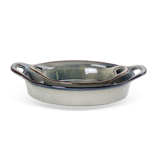 Conteúdo da embalagem: 2 travessas ovais em cerâmica com alças (1 pequena e 1 média).