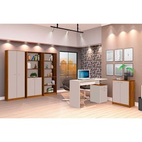 Conjunto 3 Armários Organizador e 1 Mesa Escrivaninha Office 1 Balcão Escritório OffWhite com Freijó - Rede Móveis - Off White