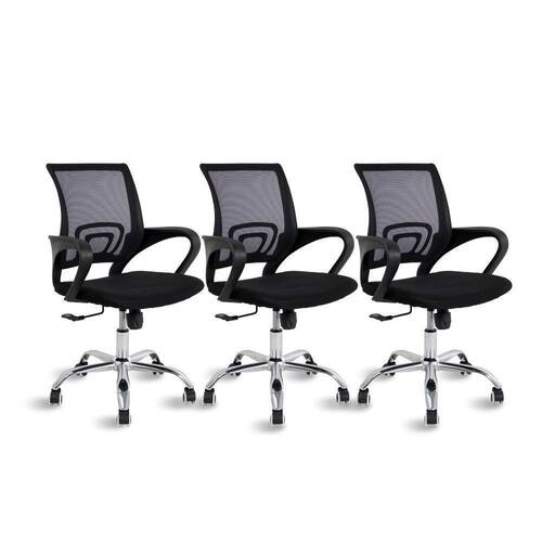 Conjunto 3 Cadeiras De Escritório Diretor Clint - Travel Max O conjunto de 3 Cadeiras de Escritório Diretor Clint da Healer une beleza, conforto e materiais resistentes para decorar o seu ambiente de trabalho e trazer conforto aos usuários. Disponíveis na cor preta as cadeiras do conjunto são super confortáveis, possuem regulagem de altura em gás, são reclináveis com acostamentos e assentos em tela.Além disso, possuem acabamento em plástico e aço cromado, contêm rodas de plástico reforçado. Por isso, são ideais para aprimorar a locomoção pelo espaço da mesa. Para o conforto do usuário as cadeiras de escritórios do estilo diretor possuem braços de apoio para os momentos de descanso. O conforto e a qualidade que você precisa no seu escritório está na Cadeira Diretor Clint. Clique em comprar! Marca: HEALER