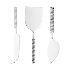 O conjunto de facas de queijo inclui: 1 faca de queijo duro, 1 faca de queijo macio, 1 faca de pino.