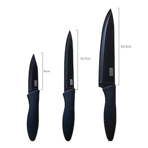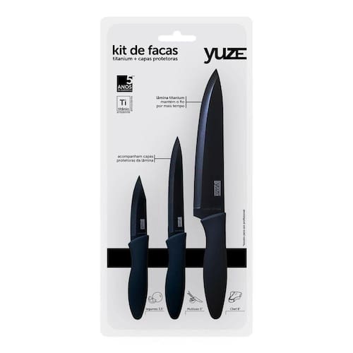 CONJUNTO 3 FACAS TITANIUM - BLACK YUZE Se você busca por facas com bom desempenho, qualidade e elegãncia, o Conjunto Black Titanium Yuze é a escolha São todas com lâminas de aço inoxidável e revestimento em titânio. Podem ser afiadas normalmente e este revestimento proporciona maior durabilidade, evitando que oxidem e não deixando gosto metálico nos alimentos, benefícios idênticos aos das facas de cerâmica. São laváveis na lava-louças e possuem cabo soft touch - sensível ao toque. Presente ideal para quem manda bem na cozinha
