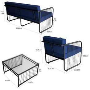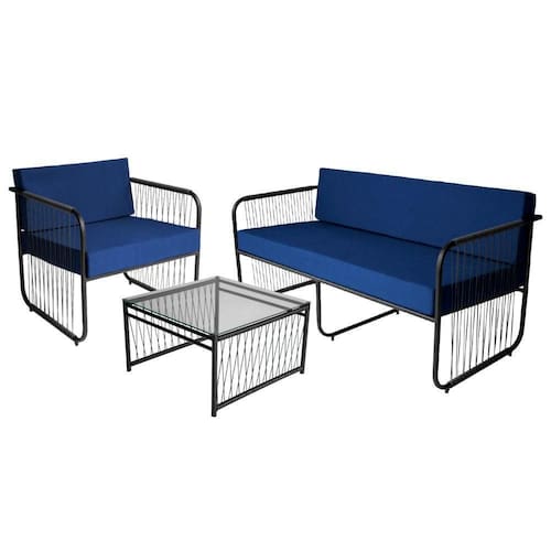 Conjunto 3 Peças Em Aço Carbono E Fibra Sintética Córdova Preto/azul Este elegante conjunto foi desenvolvido para transformar seu ambiente interno com sofisticacao e conforto. Com estrutura em aco carbono de alta qualidade e acabamento em fibra sintetica, oferece resistencia e durabilidade para suportar as diversas ocasioes, ideal para areas como gourmet, externas, de churrasqueira, recepcao, ediculas e muito mais. A namoradeira e as poltronas possuem assentos estofados com tecido impermeavel, proporcionando conforto durante longas horas de lazer. O design artesanal de cada peca garante exclusividade, fazendo deste conjunto uma opcao perfeita para quem busca estilo e funcionalidade.