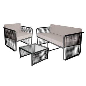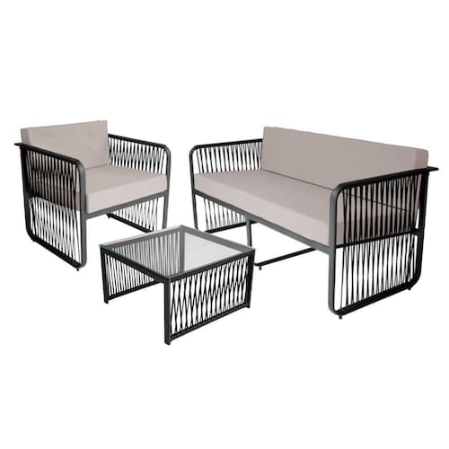 Conjunto 3 Peças Em Alumínio E Corda Náutica Santiago Preto/branco O conjunto Santiago para Area Externa traz sofisticacao e conforto ao Ar Livre! Transformando sua area externa em um ambiente elegante e aconchegante. O conjunto e feito com estrutura em aluminio de alta qualidade e acabamento em corda nautica e tampo de vidro. Este conjunto combina durabilidade, design requintado e um aconchego incomparavel. O conjunto oferece conforto total com assentos e encosto estofados em tecido impermeavel, garantindo maciez e praticidade. O acabamento e realizado a mao, utilizando corda nautica trancada, o que acrescenta charme e um toque exclusivo ao ambiente.