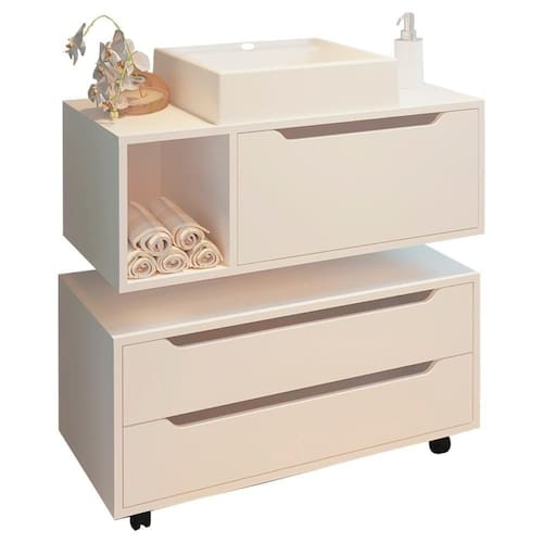 Conjunto 3 Peças Para Banheiro BN3600X43X44, uma ótima opção para quem busca por um banheiro elegante e cheio de personalidade. Gabinete e Balcão com estrutura em MDP de 15mm, proporcionando maior durabilidade e resistência, contando com acabamento em pintura UV (semi - brilho). Gabinete composto por 1 porta com articulador e dobradiças metálicas e 1 nicho lateral para armazenar itens. Suportando 10kg o tampo e 3kg o nicho. Balcão composto por 2 gavetas com frente usinada e corrediças metálicas e acompanha 4 rodízios. Suportando 15kg o tampo e 3kg cada gaveta. Cuba produzida em mármore sintético, contando com acabamento em brilho polido. Suportando até 4 litros e 10kg. Possui furação para instalação de torneira (torneira não inclusa). Unindo elementos do design contemporâneo, que proporcionam uma ambientação intimista e com acabamentos refinados. Estes móveis chegarão na sua casa separados em 3 volumes.