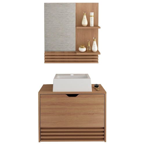 Conjunto 3 Peças Para Banheiro BN3630X13X14, uma ótima opção para quem busca por um banheiro elegante e cheio de personalidade. Gabinete e Espelheira com Estrutura em MDP de 15mm, proporcionando maior durabilidade e resistência, contando com acabamento em pintura UV (semi - brilho). Gabinete composto por 1 porta basculante com articulador e dobradiças metálicas e 1 gaveta em detalhe ripado com corrediças metálicas. Suportando 10kg o tampo e 3kg a gaveta e interno. Espelheira composta por 2 prateleiras para armazenar itens, base em detalhe ripado e espelho com design retangular. Suportando 3kg cada prateleira. Cuba produzida em mármore sintético, contando com acabamento em brilho polido. Suportando até 4 litros e 10kg. Possui furação para instalação de torneira (torneira não inclusa). Unindo elementos do design contemporâneo, que proporcionam uma ambientação intimista e com acabamentos refinados. Estes móveis chegarão na sua casa separados em 3 volumes.