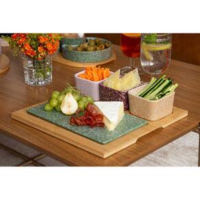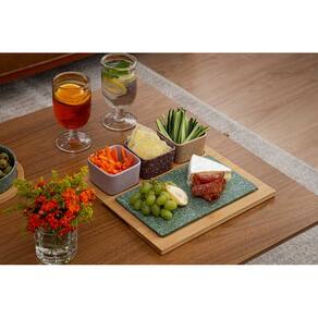 O conjunto acompanha duas tábuas, sendo uma em porcelana e outra em bambu, proporcionando versatilidade na hora de servir e organizar os alimentos. Uma opção funcional e decorativa para uso diário, encontros com amigos, reuniões em família ou para presentear.
