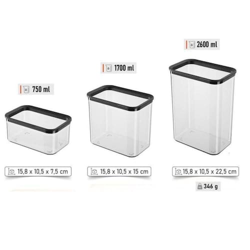 Conjunto 3 Potes Herméticos de Plástico Organize a sua despensa com potes herméticos e práticos Ideal para armazenar alimentos como grãos, massas, cereais e petiscos com segurança e praticidade. Fabricados em plástico PP livre de BPA, os potes possuem tampa com vedação em silicone, garantindo fechamento hermético contra umidade, ar e insetos. Design quadrado e empilhável para otimizar o espaço, transparência para visualizar o conteúdo e resistência a micro-ondas e freezer aumentam a versatilidade. Material: PP livre de BPA; tampa com vedação de silicone Formato quadrado e empilhável para melhor aproveitamento de espaço Transparência que facilita visualizar o conteúdo Resistentes a micro-ondas e freezer Disponíveis em cores Itens Inclusos: 01 Pote 750 ml 01 Pote 1700 ml 01 Pote 2600 ml Especificações: Pote 2600 ml: 22,5 cm altura x 10,8 cm largura x 16,5 cm comprimento Pote 1700 ml: 15 cm altura x 10,8 cm largura x 16,5 cm comprimento Pote 750 ml: 7,5 cm altura x 10,8 cm largura x 16,5 cm comprimento Material: Plástico Peso conjunto: 880 g Cor: Pote transparente com tampa preta Conjunto: 01 três potes herméticos de plástico. Compre agora e organize já a sua despensa. Marca: Não Informado
