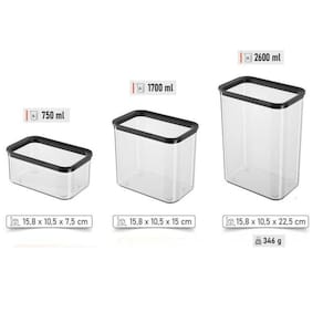 Conjunto 3 Potes Herméticos de Plástico Organize a sua despensa com potes herméticos e práticos Ideal para armazenar alimentos como grãos, massas, cereais e petiscos com segurança e praticidade. Fabricados em plástico PP livre de BPA, os potes possuem tampa com vedação em silicone, garantindo fechamento hermético contra umidade, ar e insetos. Design quadrado e empilhável para otimizar o espaço, transparência para visualizar o conteúdo e resistência a micro-ondas e freezer aumentam a versatilidade. Material: PP livre de BPA; tampa com vedação de silicone Formato quadrado e empilhável para melhor aproveitamento de espaço Transparência que facilita visualizar o conteúdo Resistentes a micro-ondas e freezer Disponíveis em cores Itens Inclusos: 01 Pote 750 ml 01 Pote 1700 ml 01 Pote 2600 ml Especificações: Pote 2600 ml: 22,5 cm altura x 10,8 cm largura x 16,5 cm comprimento Pote 1700 ml: 15 cm altura x 10,8 cm largura x 16,5 cm comprimento Pote 750 ml: 7,5 cm altura x 10,8 cm largura x 16,5 cm comprimento Material: Plástico Peso conjunto: 880 g Cor: Pote transparente com tampa preta Conjunto: 01 três potes herméticos de plástico. Compre agora e organize já a sua despensa. Marca: Não Informado