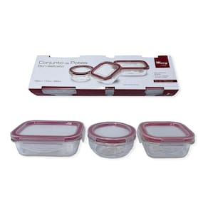 ESPECIFICAÇÕES: - Material: Vidro Borossilicato e Plástico - Dimensões: Redondo 9,5cm diâmetro x 4,8cm altura / Quadrado 9,5cm largura x 9,5cm profundidade x 4,8cm altura / Retangular 13cm largura x 9,5cm profundidade x 4,8cm altura - Cor: Vidro transparente / Tampa com vedação vermelha - Capacidade: Redondo 150ml / Quadrado 170ml / Retangular 250ml - Quantidade: 03 unidades- Resistente à temperaturas: Forno 450ºC / Freezer -40ºC- Formato: Redondo, Quadrado e Retangular -peso: