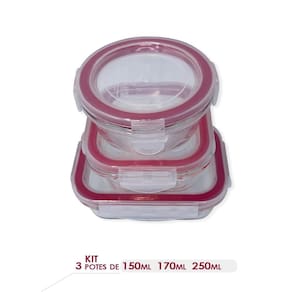 ESPECIFICAÇÕES: - Material: Vidro Borossilicato e Plástico - Dimensões: Redondo 9,5cm diâmetro x 4,8cm altura / Quadrado 9,5cm largura x 9,5cm profundidade x 4,8cm altura / Retangular 13cm largura x 9,5cm profundidade x 4,8cm altura - Cor: Vidro transparente / Tampa com vedação vermelha - Capacidade: Redondo 150ml / Quadrado 170ml / Retangular 250ml - Quantidade: 03 unidades- Resistente à temperaturas: Forno 450ºC / Freezer -40ºC- Formato: Redondo, Quadrado e Retangular -peso: