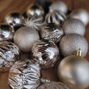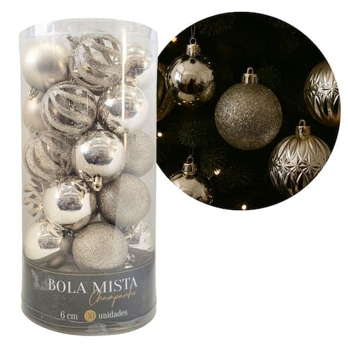 Decore sua árvore de Natal com elegância e sofisticação com este kit completo de 30 bolas natalinas champanhe, em um mix de texturas luxuosas que incluem modelos glitter, lisos, foscos e vazados em arabesco. Uma combinação perfeita para criar uma decoração harmônica e encantadora.