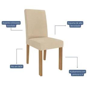 Conjunto 4 Cadeiras Maia Nature/linho Gengibre - Cimol Móveis Nature/linho Gengibre Conjunto 4 Cadeiras Maia - Cimol Móveis O Conjunto de Cadeiras Maia é perfeito para complementar sua sala de jantar, oferecendo estrutura resistente em MDF com acabamento em pintura UV. O assento e encosto são revestidos em tecido linho e espuma de alta densidade garantindo aconchego e durabilidade. Com pés em MDF e capacidade para suportar até 100kg, essas cadeiras são a escolha ideal para quem busca estilo e funcionalidade no dia a dia. ESPECIFICAÇÕES: - Estrutura em MDF - Pintura UV - Revestimento em tecido linho - Espuma de alta densidade - Pés em MDF - Cada cadeira tem capacidade para suportar até 100kg
