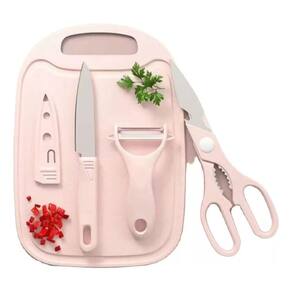 Conjunto 4 Peças De Utensílios De Cozinha Rosa O conjunto perfeito para quem busca funcionalidade e estilo na cozinha. Composto por faca, tesoura multifuncional, descascador e tábua de corte, este kit oferece tudo que você precisa para preparar suas refeições com agilidade. Lâminas em aço inoxidável que garantem cortes precisos e durabilidade. Benefícios: - Lâminas afiadas em aço inox para maior performance - Pegas ergonômicas e confortáveis - Tábua resistente, fácil de lavar - Ideal para cortes, descascas e preparo diário Itens