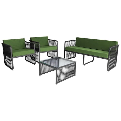 Transformando sua area externa em um ambiente elegante e aconchegante. O conjunto e feito com estrutura em aluminio de alta qualidade e acabamento em corda nautica e tampo de vidro. Este conjunto combina durabilidade, design requintado e um aconchego incomparavel. O conjunto oferece conforto total com assentos e encosto estofados em tecido impermeavel, garantindo maciez e praticidade. O acabamento e realizado a mao, utilizando corda nautica trancada, o que acrescenta charme e um toque exclusivo ao ambiente.