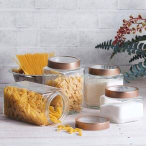 Este conjunto 4 potes de vidro com tampa de metal rosé gold da linha Gran Gastro mantém os alimentos frescos por mais tempo. Desenvolvidos em borossilicato, possuem tampas de metal, com visores de acrílico, perfeitos para manter os alimentos frescos por mais tempo. Além disso, este jogo de potes de vidro é perfeito para organizar temperos e especiarias na bancada, otimizando a organização da sua cozinha e dando um toque moderno a decoração.