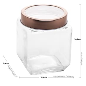 Garantia: 90 dias / Peso: 2,64kg / Cor predominante: rosé gold / Referência: 7899768075244X4 Dimensões de cada pote: 11,4cm (C) x 11,4cm (L) x 14,2cm (A); Capacidades de cada pote: 1,2 litros; Conteúdo: 4 potes; Materiais: vidro, metal e acrílico.