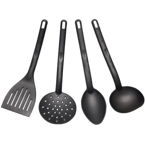 Conjunto 4 Utensílios de Cozinha Plástico Preto Kit Jogo Colher Concha Escumadeira Espátula.