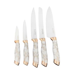 Conjunto 5 Facas Mármore com Suporte Branco Antiaderente Eleve o nível da sua cozinha com o Conjunto 5 Facas Mármore com Suporte Branco Antiaderente. Desenvolvido para quem busca precisão, durabilidade e sofisticação, este conjunto combina design contemporâneo e desempenho , garantindo cortes mais precisos e uma experiência culinária mais prazerosa no dia a dia. Ideal para chefs profissionais e para quem ama cozinhar, ele se adapta a qualquer estilo de cozinha, entregando beleza, praticidade e eficiência em um só produto. Com revestimento antiaderente de alta qualidade, as lâminas evitam que os alimentos grudem, facilitando o corte e tornando a limpeza muito mais simples e rápida. O design exclusivo em estilo mármore confere um toque luxuoso e moderno à bancada, transformando o conjunto não apenas em uma ferramenta essencial, mas também em um elemento de decoração. O suporte branco que acompanha o kit é elegante, funcional e mantém as facas organizadas e sempre ao alcance, otimizando o espaço da cozinha. As lâminas são fabricadas em aço inox resistente, garantindo durabilidade e cortes precisos em diferentes tipos de alimentos. O cabo anatômico proporciona mais conforto e segurança no manuseio, mesmo em uso prolongado. Cada faca foi projetada para uma função específica, atendendo diferentes necessidades na preparação dos pratos, desde cortar pães macios até carnes mais rígidas, legumes e verduras. Especificações Técnicas: - Material: Plástico e Aço Inox - Faca de Chef: 32,5 cm comprimento x 4 cm altura - Faca de Desossar: 32,3 cm comprimento x 3 cm altura - Faca de Pão: 33 cm comprimento x 3 cm altura - Faca de Utilidades: 20 cm comprimento x 2,5 cm altura - Faca para Corte: 24 cm comprimento x 2,5 cm altura - Acompanha suporte branco Itens Inclusos: - 01 Faca de Chef - 01 Faca de Desossar - 01 Faca de Pão - 01 Faca de Utilidades - 01 Faca para Corte - 01 Suporte Diferenciais do Produto: - Revestimento antiaderente que evita acúmulo de resíduos e facilita a limpeza - Design mármore moderno e sofisticado - Suporte elegante para melhor organização e praticidade - Lâminas afiadas e resistentes para cortes precisos - Ideal tanto para uso doméstico quanto : Este conjunto possui de 3 meses contra defeitos de fabricação, assegurando a qualidade e a confiabilidade do produto. Caso seja identificado algum problema dentro deste prazo, a ou reparo será realizado conforme as condições estabelecidas pelo fabricante, garantindo mais tranquilidade na sua compra. O Conjunto 5 Facas Mármore com Suporte Branco Antiaderente é a escolha perfeita para quem valoriza eficiência, beleza e funcionalidade na cozinha. Além de facilitar o preparo das receitas, ele traz um toque de elegância ao ambiente e se destaca como um investimento inteligente para quem busca qualidade e durabilidade em utensílios culinários.