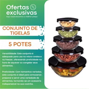 Conjunto 5pç Jogo Tigela Com Tampa De Vidro 5 Tamanhos Conjunto com 5 tigelas em vidro e tampa de plástico com capacidades diferentes para se adequar com cada necessidade na hora de armazenar seus alimentos. Conteúdo 5 peças: 1 Tigela 135ml 1 Tigela 200ml 1 Tigela 300ml 1 Tigela 400ml 1 Tigela 800ml Características: Material: Vidro e tampa de plástico Quantidade: 5peças Cor: De acordo com a disponibilidade do Marca: Não Informado