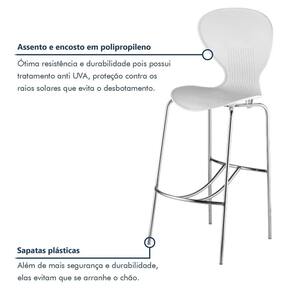 É uma banqueta de plástico com encosto para área gourmet? Sim, seu assento em polipropileno e encosto anatômico oferecem conforto mesmo em uso prolongado. Acabamento da Estrutura: Pintura Altura do assento até o chão: 71 cm Altura do Encosto: 39 cm Altura Regulável: Não Ambiente Principal: Cozinha codigo_ean: 7900288222749 Cor: Branco Cor do Produto: Branco Dobrável: Não Escala de Brilho: Semi-Fosco Informações Complementares: Por se tratar de produto injetado, pequenas variações de tonalidade de cor são intrínsecas ao produto, e não podem ser consideradas defeito. Para aprimoramento de projeto, os produtos podem sofrer modificações. Itens Inclusos: 6 Banquetas Linha ou Coleção: Flash Marca: Prima Design Material do Assento: Polipropileno Material do Encosto: Polipropileno Necessita Montagem: Não Origem do Produto: Nacional Peso: 27,4 kg Possui Apoio Para os Pés: Sim Possui Encosto: Sim Possui Rodízio: Não Recomendações de Uso, Manutenção e Limpeza: A estrutura deve ser limpa utilizando pano seco de algodão ou flanela. Se necessário, utilize pano umedecido apenas com água, secando o móvel em seguida. Não utilize solvente, álcool, acetona, lustra móveis, produtos abrasivos e outros produtos que contenham soda e ou ácidos para limpar e tirar manchas dos móveis. Não expor os móveis à luz solar e ambientes com umidade relativa elevada. Tipo de Assento: Fixo Tipo de Encosto: Fixo Marca: Não Informado