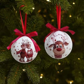 Deixe sua árvore ainda mais encantadora com este conjunto de 6 bolas natalinas decoradas, no modelo laqueado branco com estampa premium de casal de renas e rena feliz. Cada bola vem finalizada com laço vermelho e fita para pendurar, proporcionando charme e praticidade na montagem da sua decoração.