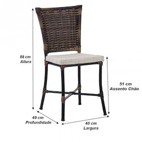 Especificações Técnicas: Cadeira Angra em alumínio com pintura eletroestática : Altura total: 87cm Altura Assento ao chão: 50cm Largura: 40cm Profundidade: 50cm Suporta até 170kg Assento almofadado com tecido impermeável