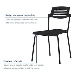 Qual o benefício de uma cadeira com tratamento anti UVA? Os produtos ganham proteção contra desbotamento que os raios solares causam. Acabamento: Pintura Acabamento da Estrutura: Pintura Altura dos Pés: 43 cm Altura Máxima dos Pés: 43.0000 Ambiente Principal: Sala de Jantar codigo_ean: 7900288186935 Cor: Preto Cor do Produto: Preto Dobrável: Não Escala de Brilho: Fosco Estrutura do Assento: Polipropileno Estrutura do Encosto: Polipropileno Giratória: Não Informações Complementares: Por se tratar de produto injetado, pequenas variações de tonalidade de cor são intrínsecas ao produto, e não podem ser consideradas defeito. Para aprimoramento de projeto, os produtos podem sofrer modificações. Itens Inclusos: 6 Cadeiras Linha ou Coleção: Clean Manual de Montagem e Instalação: https://product-hub-prd.madeiramadeira.com.br/150895454/documents/28aba02f-65cc-45c7-b982-330d151c0660303598173217513779238318.pdf Marca: Prima Design Material da Base: Aço Material Principal: Aço Necessita Montagem: Não Origem do Produto: Nacional Peso: 3,5 kg Possui Apoio para Braços: Não Possui Rodízio: Não Quantidade de Itens: 6 Recomendações de Uso, Manutenção e Limpeza: A estrutura deve ser limpa utilizando pano seco de algodão ou flanela. Se necessário, utilize panoumedecido apenas com água, secando o móvel em seguida.Não utilize solvente, álcool, acetona, lustra móveis, produtos abrasivos e outros produtos que contenhamsoda e ou ácidos para limpar e tirar manchas dos móveis.Não expor os móveis à luz solar e ambientes com umidade relativa elevada.Manter a estrutura metálica limpa, utilizando pano seco ou cera a base de silicone. Tipo de Assento: Fixo Tipo de Encosto: Fixo Marca: Não Informado