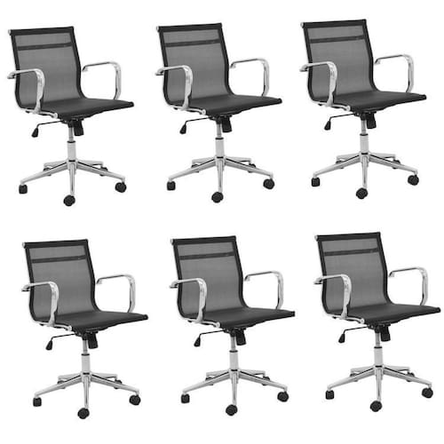 Conjunto com 6 cadeiras de escritório com estrutura em aço, revestimento em tela mesh, com encosto baixo. Possui base giratória em aço cromado e rodízios em nylon. Possui ajuste de altura (mínimo 89cm e máximo 98cm) e sistema relax. Altura do Conjunto: 89 cm Ambiente: null Ambiente Principal: Escritório Cor: Preto Informação Complementar: 1x Conjunto 4 Cadeiras de Escritório com Rodízios Office Sevilha Móveis Preto Largura: 55 cm Altura: 89 cm Peso: 8,75 kg Profundidade: 59,5 cm Necessita Montagem: Sim