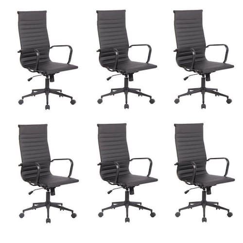 A Cadeira Sevilha já é queridinha do design e garante que seu espaço de trabalho e estudos seja confortável e funcional. Seus detalhes em aço preto dão o toque diferente que seu ambiente merece! Design contemporâneo que agrega elegância e estilo para o seu dia a dia. Conjunto com 6 Cadeiras de escritório com estrutura em aço pintado à pó preto, revestimento em poliuretano (PU), com encosto alto. Possui base giratória em aço pintado à pó preto e rodizíos em nylon. Possui ajuste de altura (mín 105cm e máx 115cm) e sistema relax. Altura do Conjunto: 105 cm Ambiente: null Ambiente Principal: Escritório Cor: Preto Informação Complementar: 1x Conjunto 2 Cadeiras de Escritório Presidente Sevilha Alta com Base Office PretoLargura: 60 cmAltura: 105 cmPeso: 10,7 kgProfundidade: 60 cmNecessita Montagem: Sim1x Conjunto 4 Cadeiras de Escritório Presidente Sevilha Alta com Base Office PretoLargura: 60 cmAltura: 105 cmPeso: 10,7 kgProfundidade: 60 cmNecessita Montagem: Sim Possui Rodízio: Sim Suporta Até (kg): 120 kg