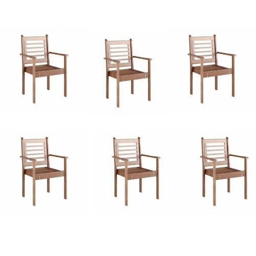 *AMBIENTACOES MERAMENTE ILUSTRATIVAS* Acabamento da Estrutura: Stain Ambiente Principal: Jardim e Varanda Complexidade da Montagem: Baixa: pode ser montado por uma pessoa sozinha Cor: Madeira Cor do Produto: Madeira Escala de Brilho: Fosco Estrutura do Assento: Madeira Macica Estrutura do Encosto: Madeira Macica Giratória: Não Informações Complementares: Devido a madeira ser maciça pode sofrer pequenas variações em sua coloração. Itens Inclusos: 6 cadeiras empilhaveis Linha ou Coleção: Pink Sands Manual de Montagem e Instalação: https://product-hub-prd.madeiramadeira.com.br/901753/documents/dec40685-6faf-458c-81db-9bc89696f4cf1881797poltronapinksands.pdf Material da Base: madeira Necessita Montagem: Sim Origem do Produto: Nacional Peso: 9 kg Possui Apoio Para os Pés: Não Possui Rodízio: Não Recomendações de Uso, Manutenção e Limpeza: Se exposta a intempéries, necessária manutenção de tempos em tempos. Para a manutenção a fábrica indica uso de óleo mineral e nada mais além disso. Antes de começar a utilizar, também sugerimos a aplicação de óleo mineral, que hidrata e protege a madeira. Resistente à Chuva: Sim Sistema de Montagem: parafusos que acompanham o produto Suporta Até (kg): 130 kg Tipo de Assento: Fixo Tipo de Encosto: Fixo Tipo de Madeira Maciça: Eucalipto