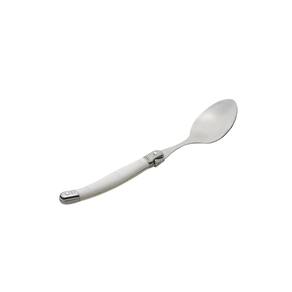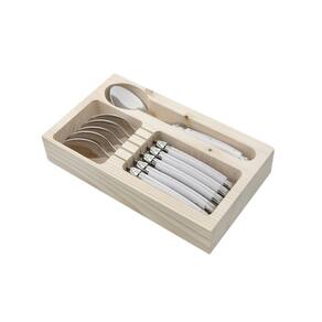 Toda a tradição das facas Laguiole é encontrada nesta linha de colheres. Feitas em aço inoxidável de altíssima qualidade com cabo em ABS branco. O conjunto de colheres é entregue em uma elegante bandeja de madeira.