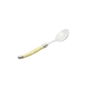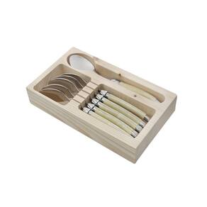 Conjunto de Colheres Laguiole LA TOUR™ Luxo.Toda a tradição das facas Laguiole é encontrada nesta linha de colheres. Feitas em aço inoxidável de altíssima qualidade com cabo em ABS marfim. O conjunto de colheres é entregue em uma elegante bandeja de madeira.Descrição:-materiais: Madeira e Aço Inox-tamanho: 25,5cm x 13cm x 3cm-cor: Marfim-peso: 0,401g-utilização: De preferência por não usar maquina de lavar-louças.