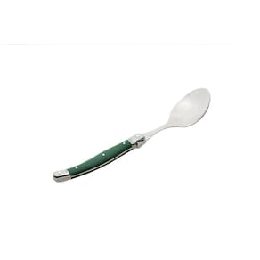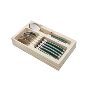 Conjunto de Colheres Laguiole LA TOUR tm Luxo.Toda a tradição das facas Laguiole é encontrada nesta linha de colheres. Feitas em aço inoxidável de altíssima qualidade com cabo em ABS verde. O conjunto de colheres é entregue em uma elegante bandeja de madeira.Descrição:-materiais: Madeira e Aço Inox-tamanho: 25,5cm x 13cm x 3cm-cor: Verde-peso: 0,401g-utilização: De preferência por não usar maquina de lavar-louças.