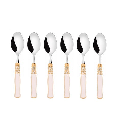 O jogo de 6 colheres para sobremesa da Linha Selene Gold-Plated Ring da Bugatti é inspirado na beleza da lua e na sua dupla natureza: o anel dourado com motivo trançado é combinado com um cabo em acrílico madrepérola, disponível em branco marfim e preto escuro , assim como as faces da lua.