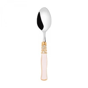 O jogo de 6 colheres de mesa da Linha Selene Gold-Plated Ring da Bugatti é inspirado na beleza da lua e na sua dupla natureza: o anel dourado com motivo trançado é combinado com um cabo em acrílico madrepérola, disponível em branco marfim e preto escuro , assim como as faces da lua.