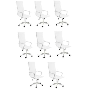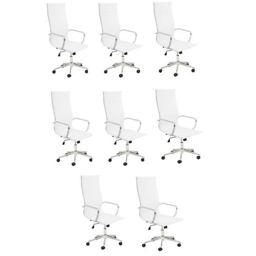 Conjunto com 8 cadeiras de escritório com estrutura em aço, revestimento em Poliuretano, com encosto alto. Possui base giratória em aço cromado e rodízios em nylon. Possui ajuste de altura (mínimo 105cm e máximo 115cm) e sistema relax. Produto Montado: Sim Altura do Conjunto: 105 cm Ambiente: null Ambiente Principal: Escritório Apoio para Braços Estofado: Não codigo_ean: 7909903318737 Complexidade da Montagem: Baixa: pode ser montado por uma pessoa sozinha Cor: Branco Cor da Base: Cromado Cor do Produto: Branco Empilhável: Não Giratória: Sim Informação Complementar: 2x Conjunto 4 Cadeiras de Escritório Presidente Giratória Sevilha Alta Branco Largura: 60 Altura: 105 Peso: 10.2 Profundidade: 60 Necessita Montagem: Sim