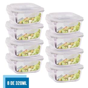 Conjunto com 8 Potes de Vidro com Tampa Hermética Quadrado 320ml